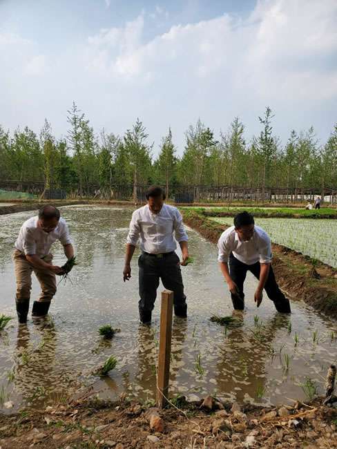 日前,米兰app入口站官网-米兰(中国)董事长梁雨、总裁谢俊率集团高级管理人员来到位于北京西四环外的锦绣大地生态园,在景色迷人的玉泉山山下,同志们挽起裤脚跃进田里,生态园农业技术员一边弓腰示范,一边讲解道“插秧是个技术活,将秧苗窝在虎口处,既要轻又要稳,用巧劲儿将秧苗抛在泥里,不能抛得太深,又要确保植保灌溉时,秧苗不漂浮在水面上。”